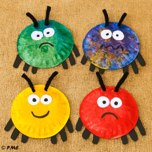 Quatre insectes colorés, chacun porteur d’une émotion : joie, peur, surprise et tristesse. Fabriqués avec des assiettes en carton, du papier, des cure-pipes et beaucoup d’imagination enfantine.