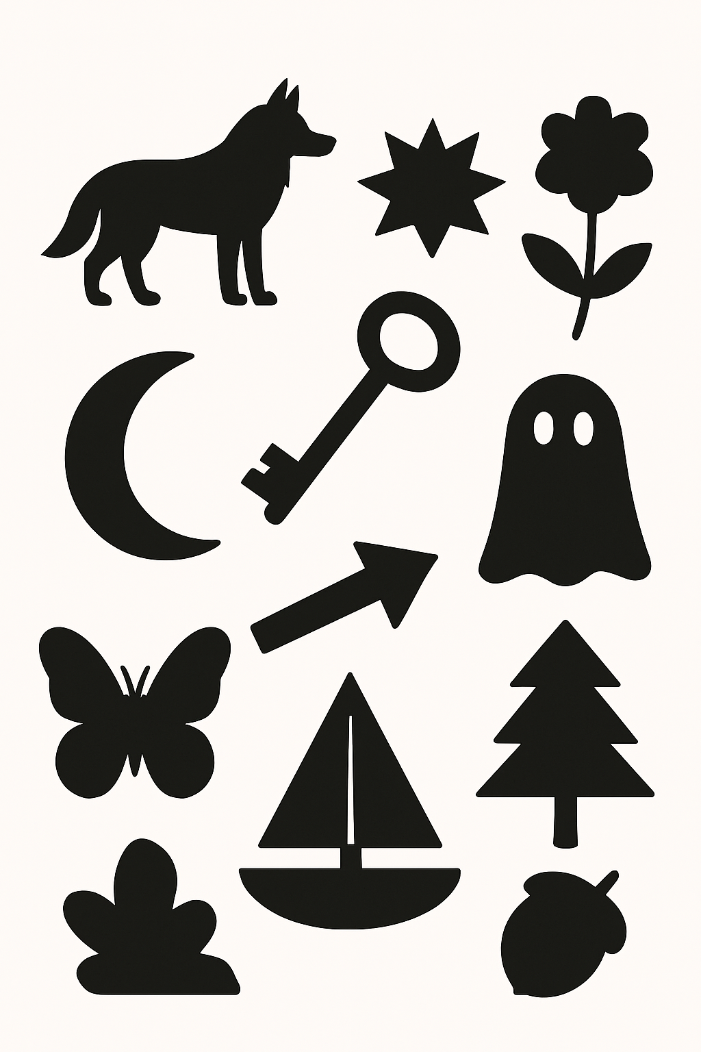 • Des formes découpées en carton noir (animaux, objets, personnages, formes abstraites)