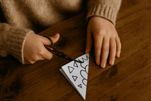 Sur une face du triangle, dessine des formes à découper : demi-cercles, triangles, vagues, pointes… Encourage les enfants à inventer leurs propres motifs.