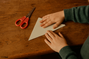 Découpe un carré (15×15 cm est idéal). Plie-le en deux, puis en quatre, puis en triangle selon le modèle choisi. Plus il est plié, plus le motif sera complexe.